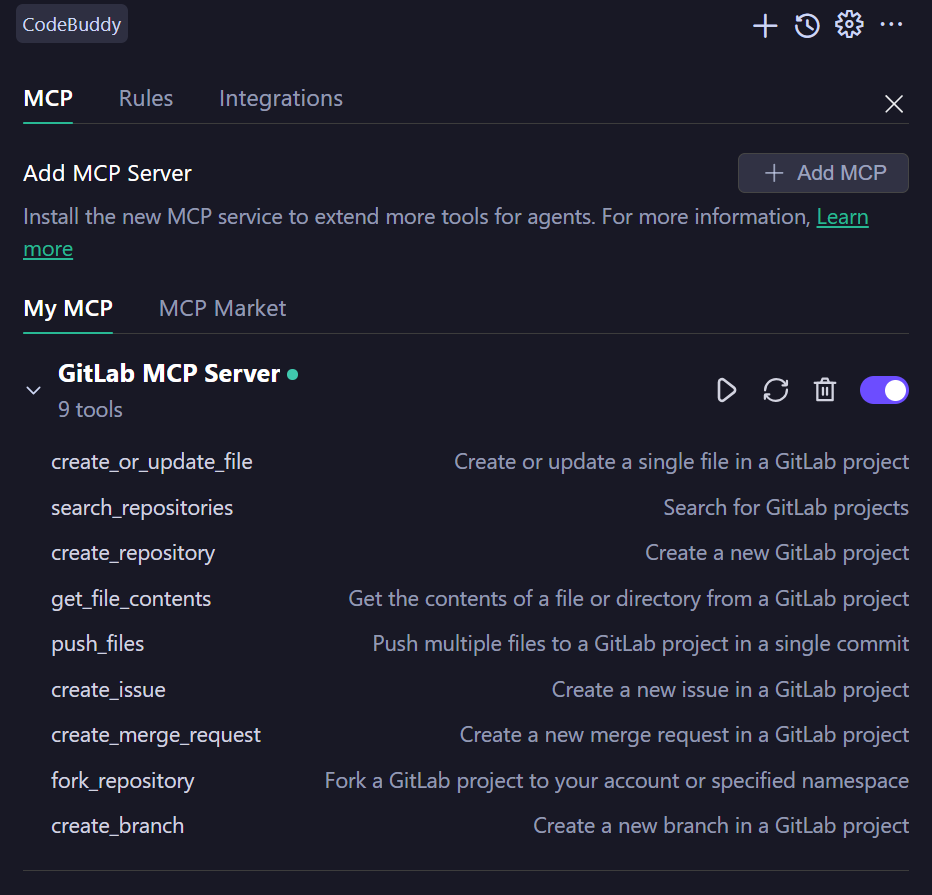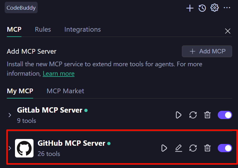 After saving, the MCP servers will be installed automatically. In the My MCP tab, the MCP server list will be displayed. If successful, it will show a green status; otherwise, it will show a red status.
