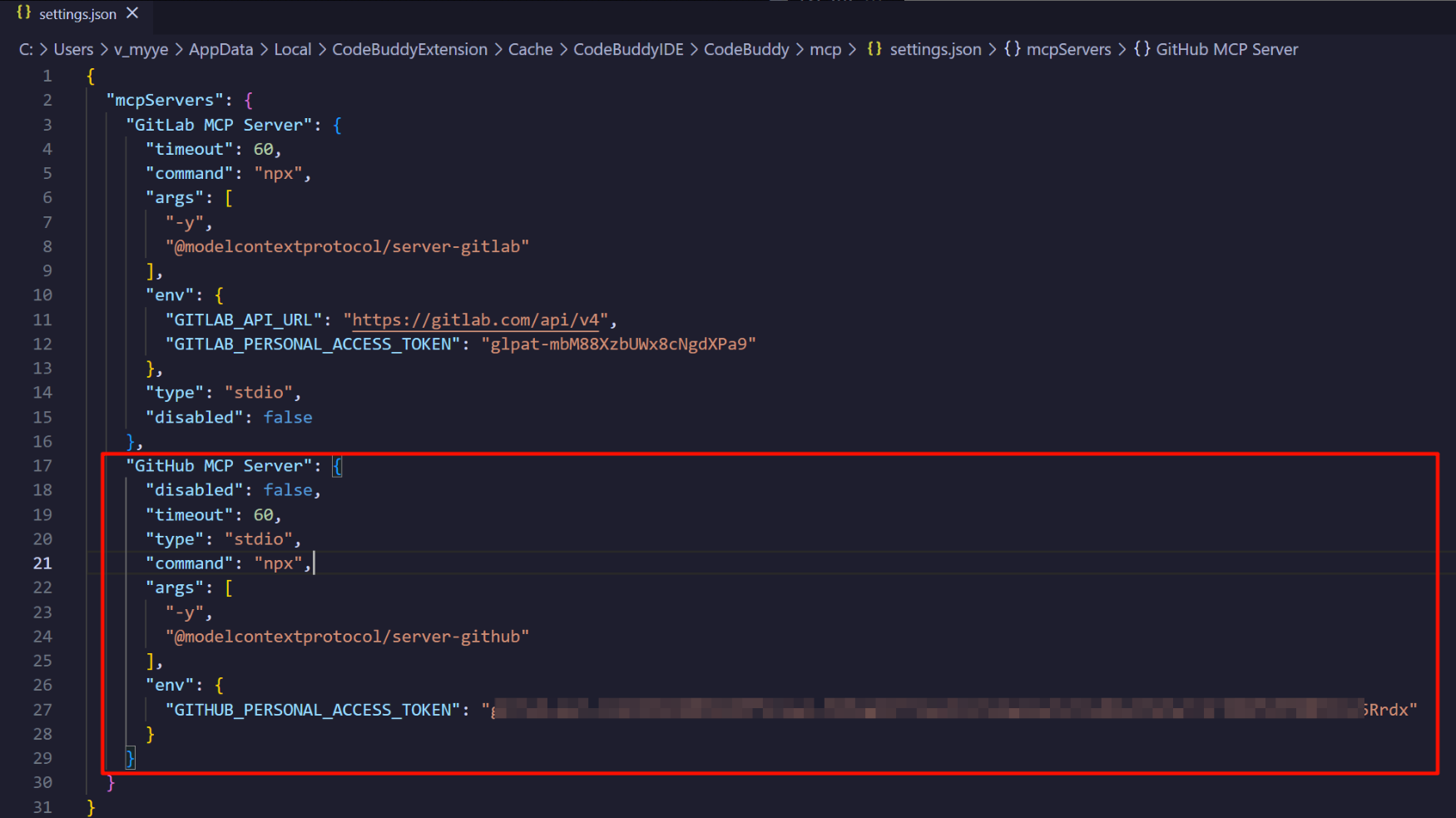 Add the configuration information for the MCP server in the JSON configuration file. For example, for the GitHub MCP server: