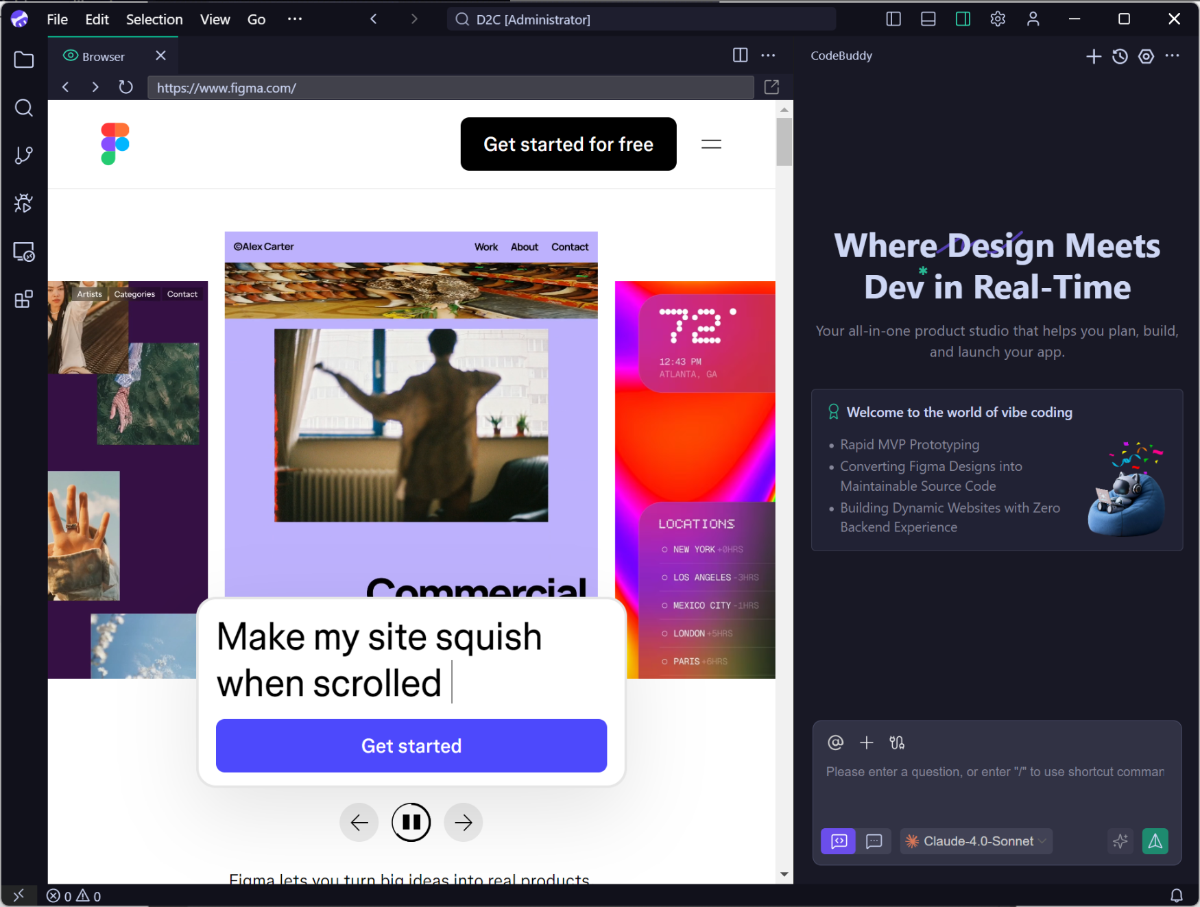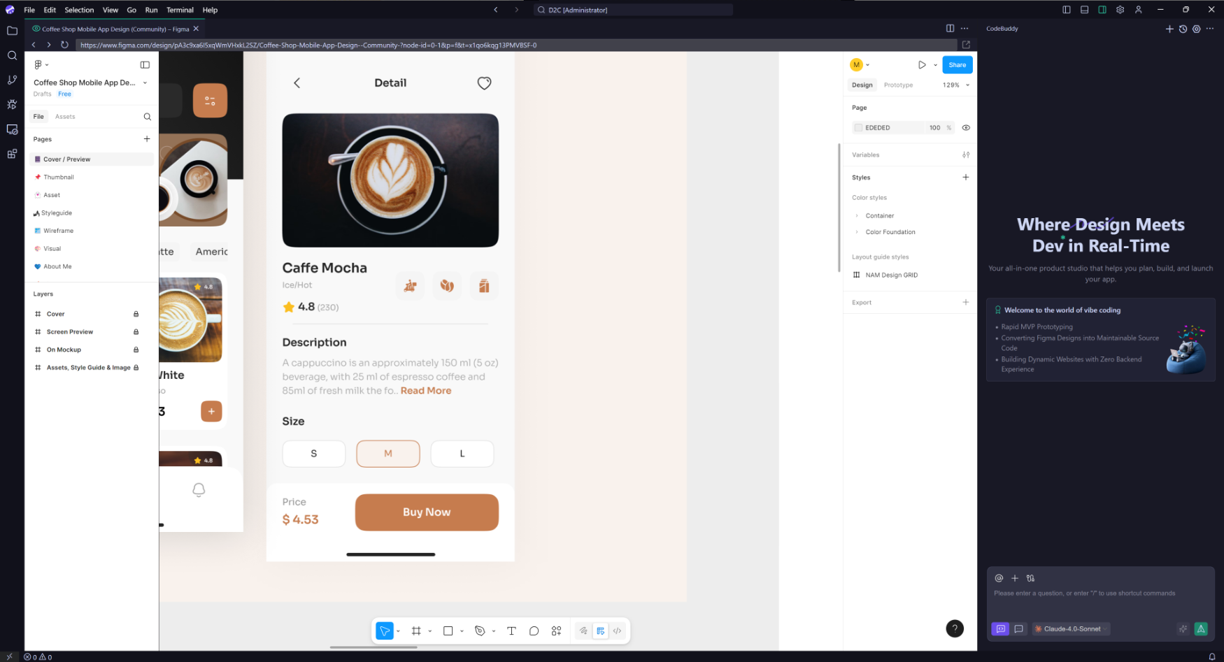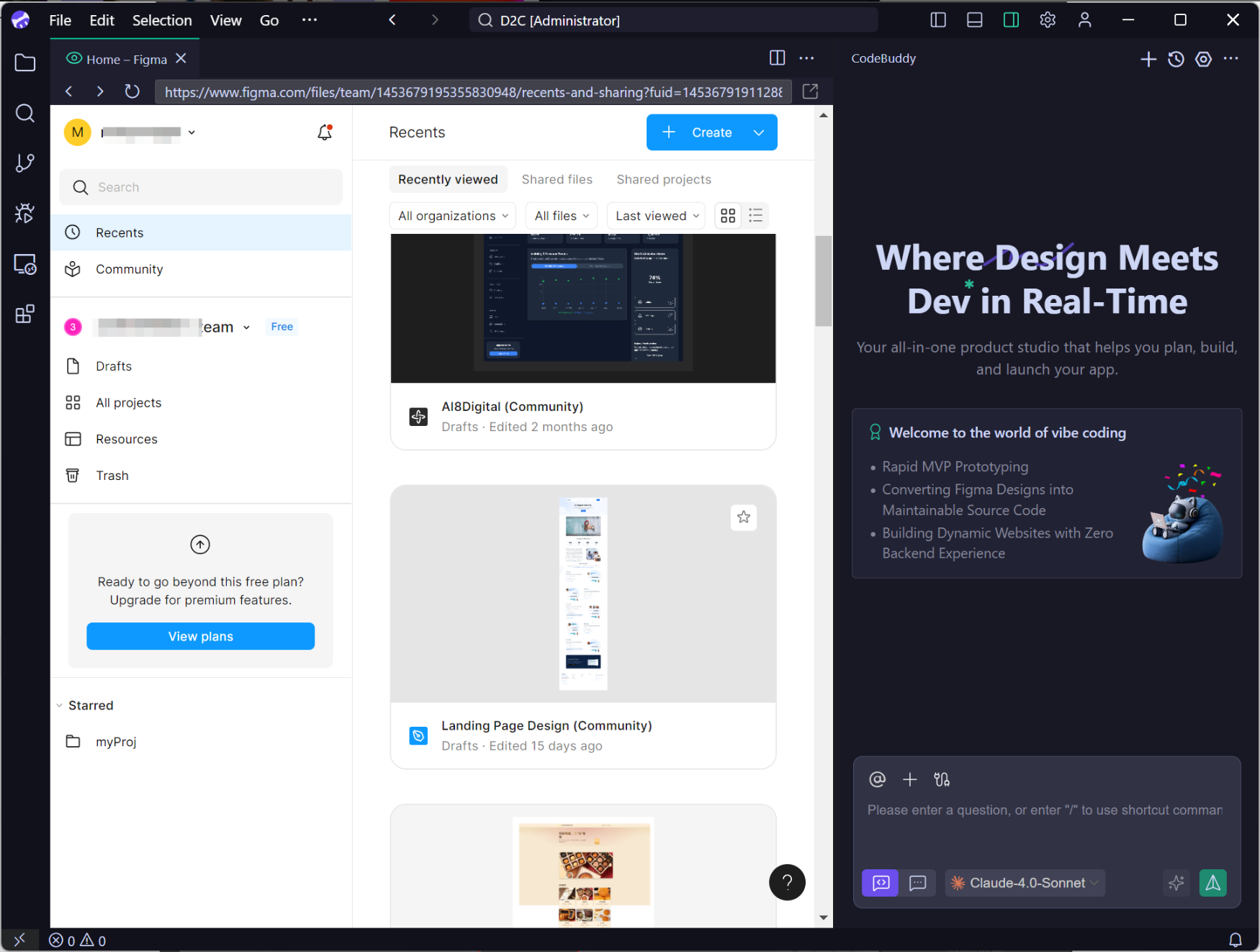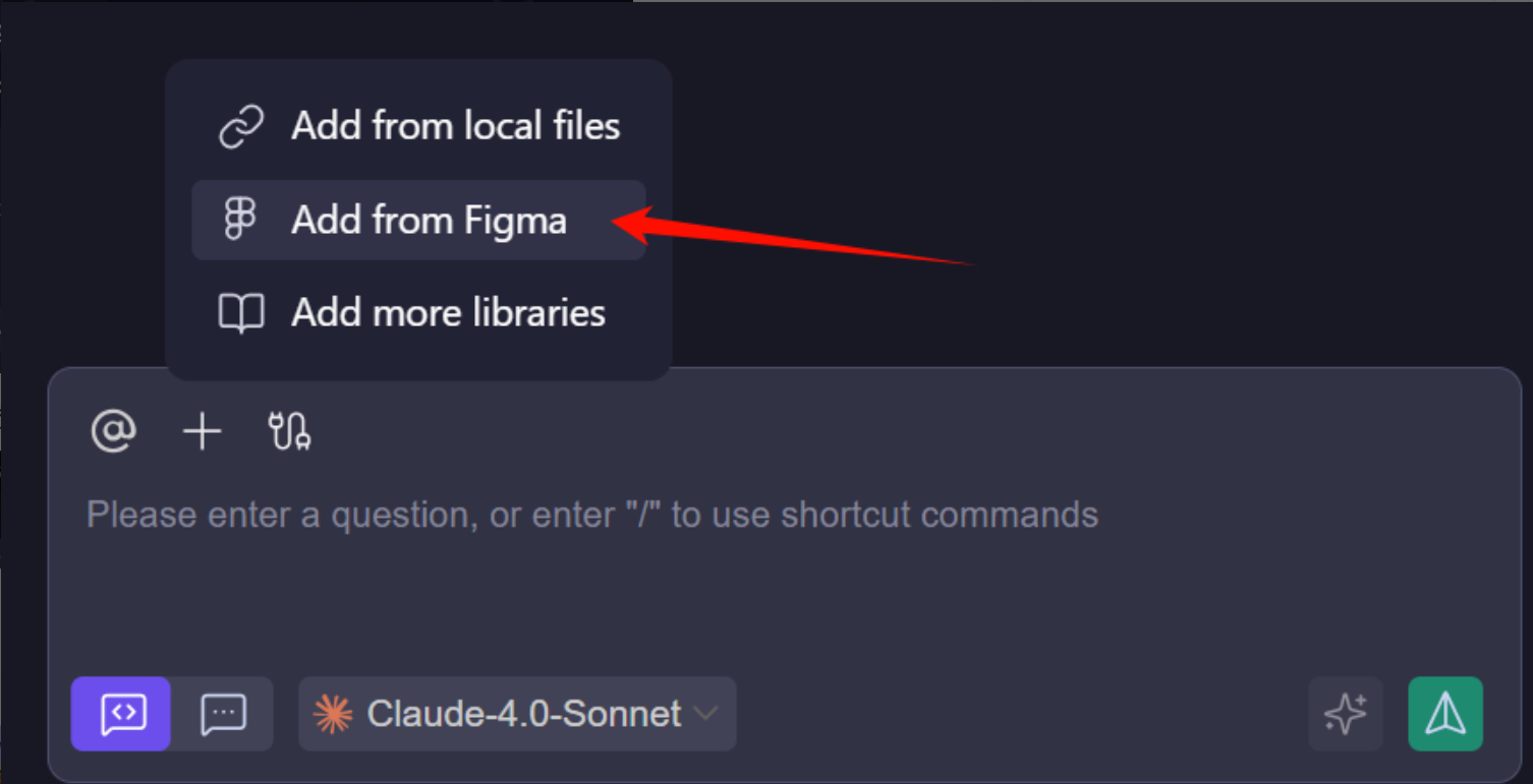 One of the core features of CodeBuddy IDE is the ability to generate code from designs. It supports the Add from Figma feature button to import design drafts from the built-in Figma into the IDE, accurately converting Figma designs into production code. Below is the process of importing design components from Figma into the IDE.
