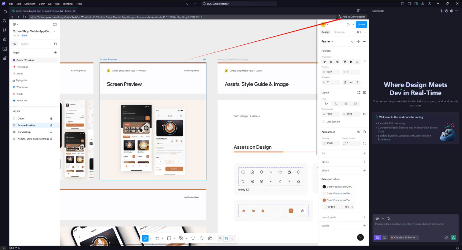 In the Layers section, select the required components or regions, and then click the Add to Conversation button in the top-right corner to import the design into the IDE.