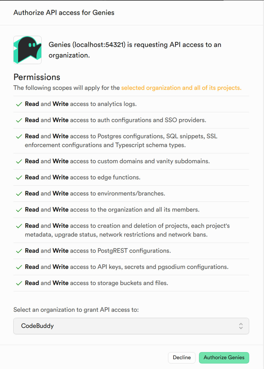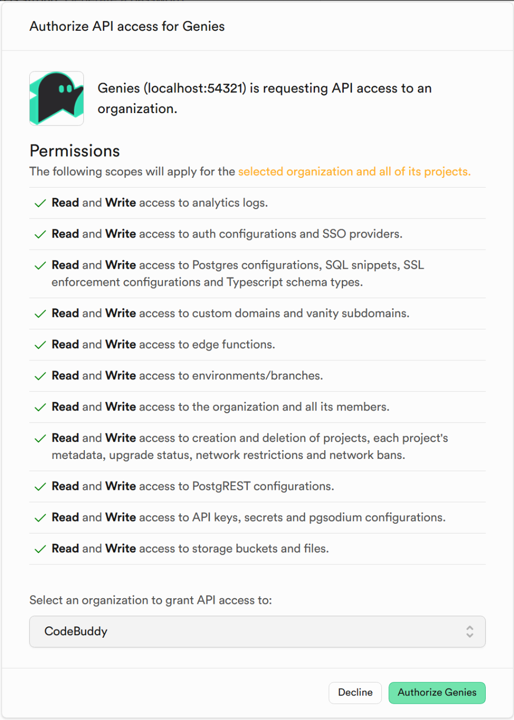 In CodeBuddy IDE, select the Supabase project you want to connect to, and then connect.