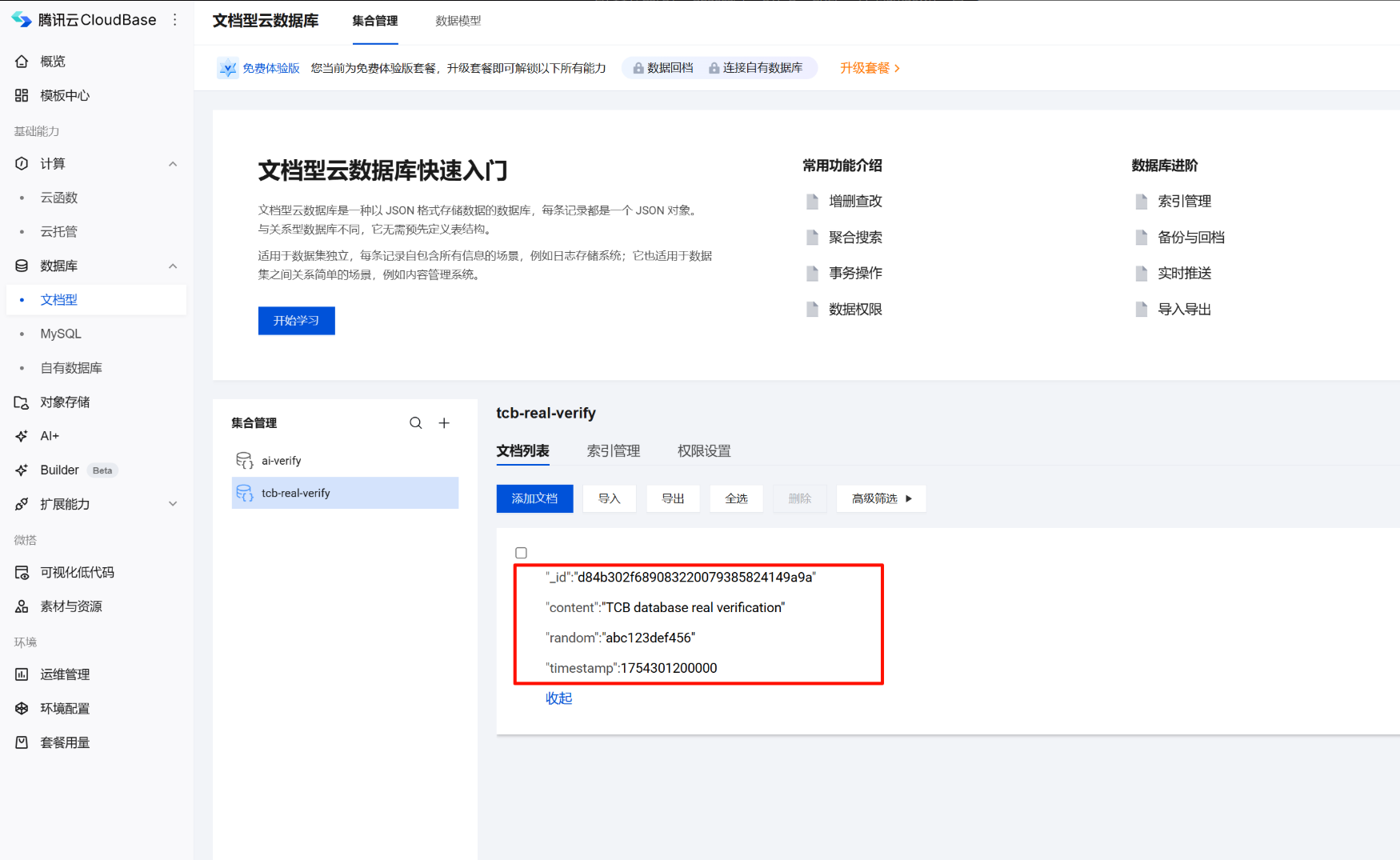 Log in to the Tencent CloudBase Development Platform to view, and you can see that the document has been successfully created in the cloud database.