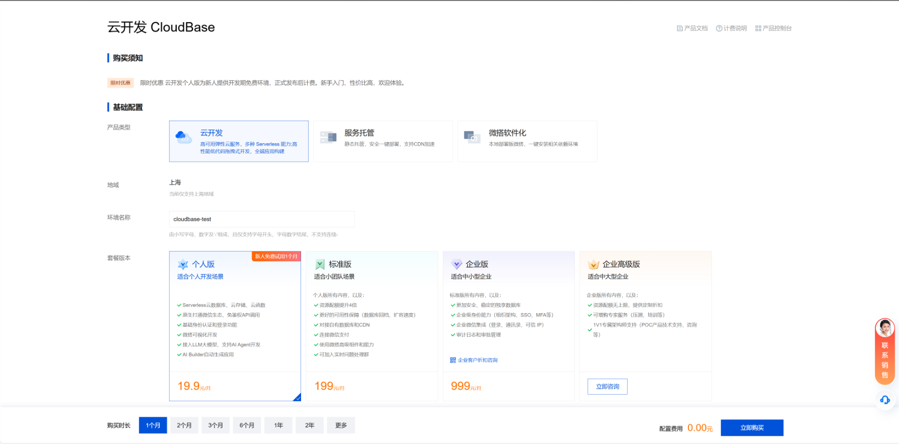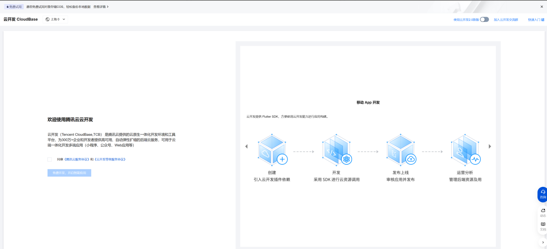 Before connecting to TCB, you need to enable the cloud environment. Log in to the Tencent CloudBase控制台,agree to the authorization agreement, and click Free Development, Start Smart Application.