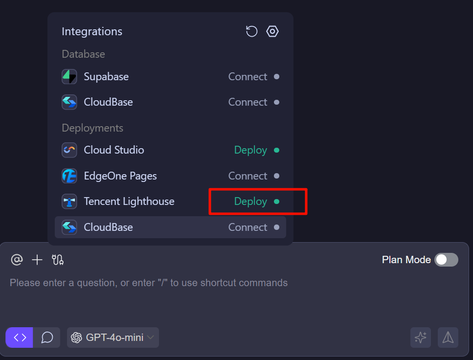 In the toolbar above the conversation panel, click Deploy next to Tencent Lighthouse in the Integrations list to trigger deployment.