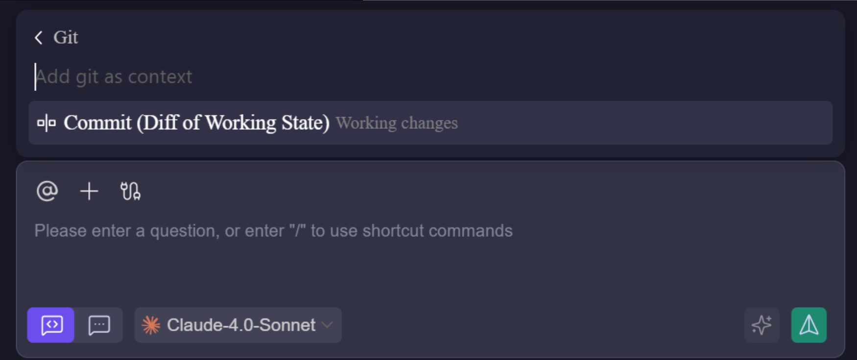 @Working changes: References all uncommitted changes in the current workspace, including staged changes, unstaged changes, and untracked files.