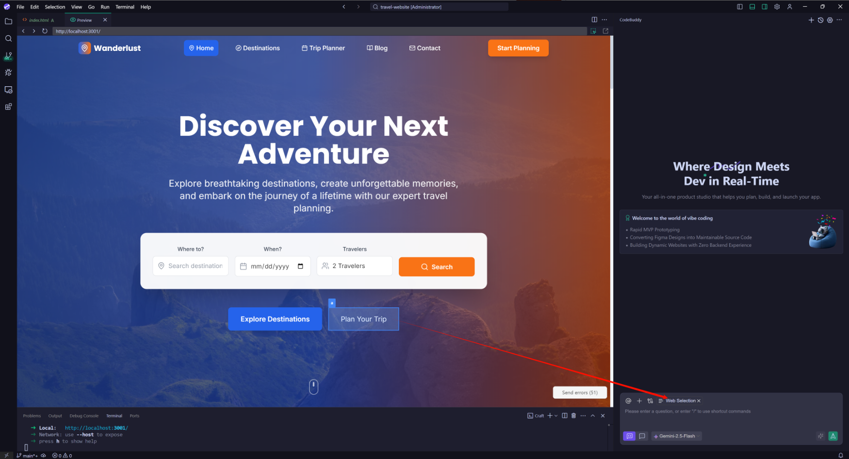 CodeBuddy IDE supports automatic rendering of code changes via a browser engine, allowing you to instantly view the runtime effect of the current project code without switching tools or manually starting services—enabling real-time debugging and preview.
