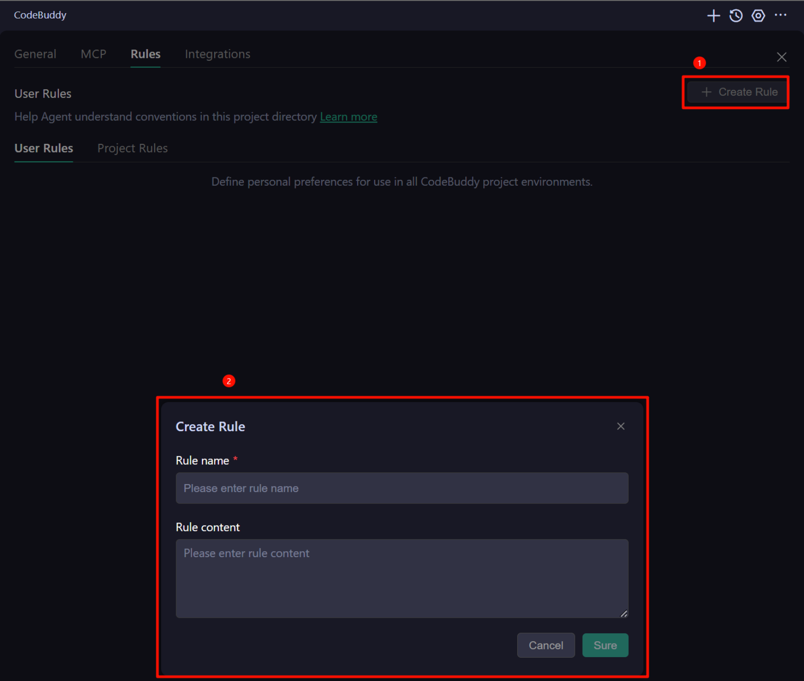 Capture personal preferences such as coding style, general requirements, frequent commands, or habits. Once saved, these Rules are automatically injected into every chat, Composer, and Command-K invocation. They are tied to your CodeBuddy IDE account and apply regardless of which project is open.