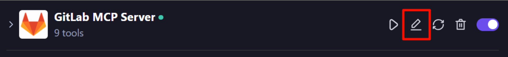 To modify or update an MCP Server’s configuration, click the Edit button to make changes directly in the JSON configuration file.
