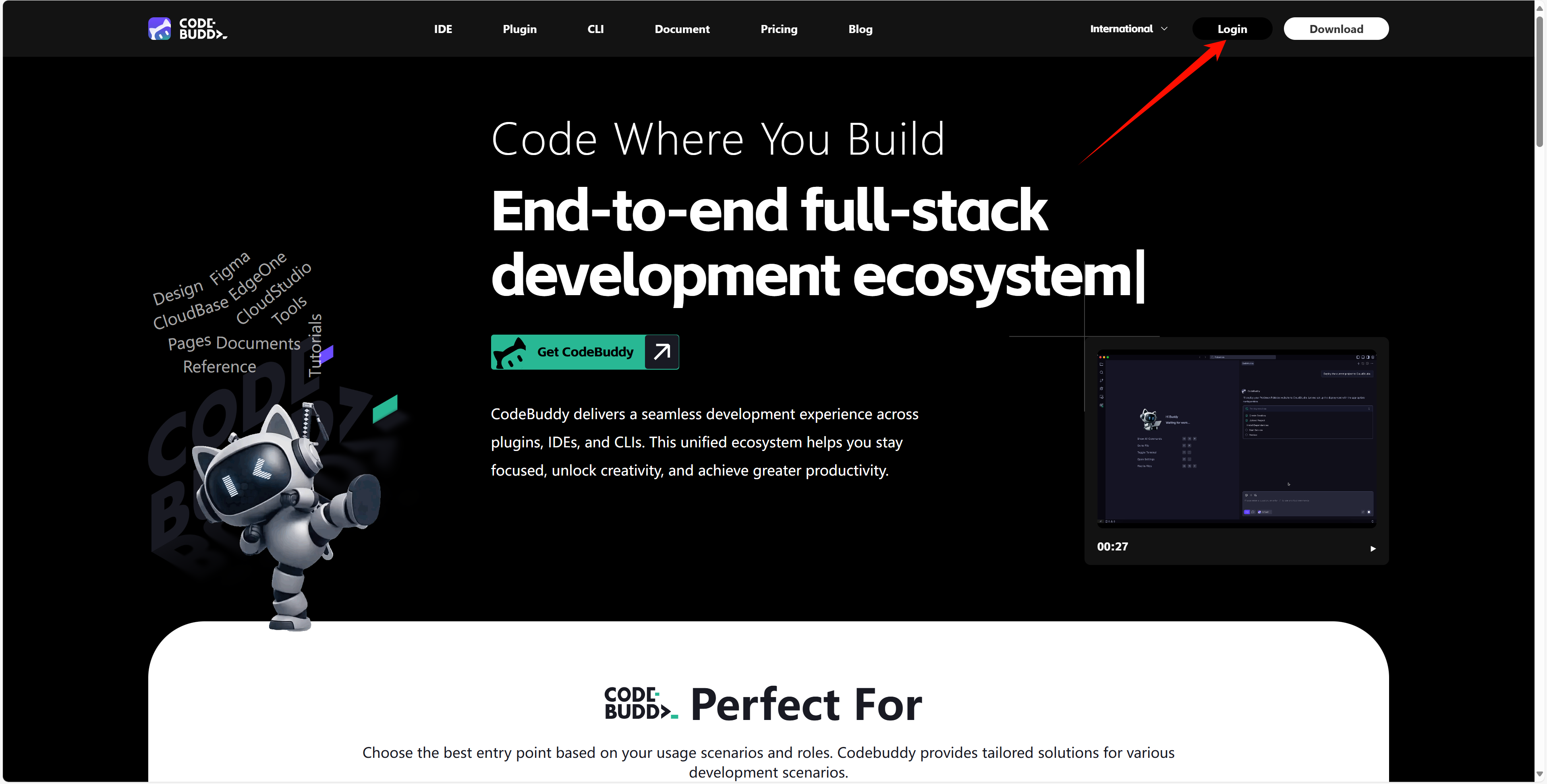 Visit the official site CodeBuddy and click Login in the upper-right corner.