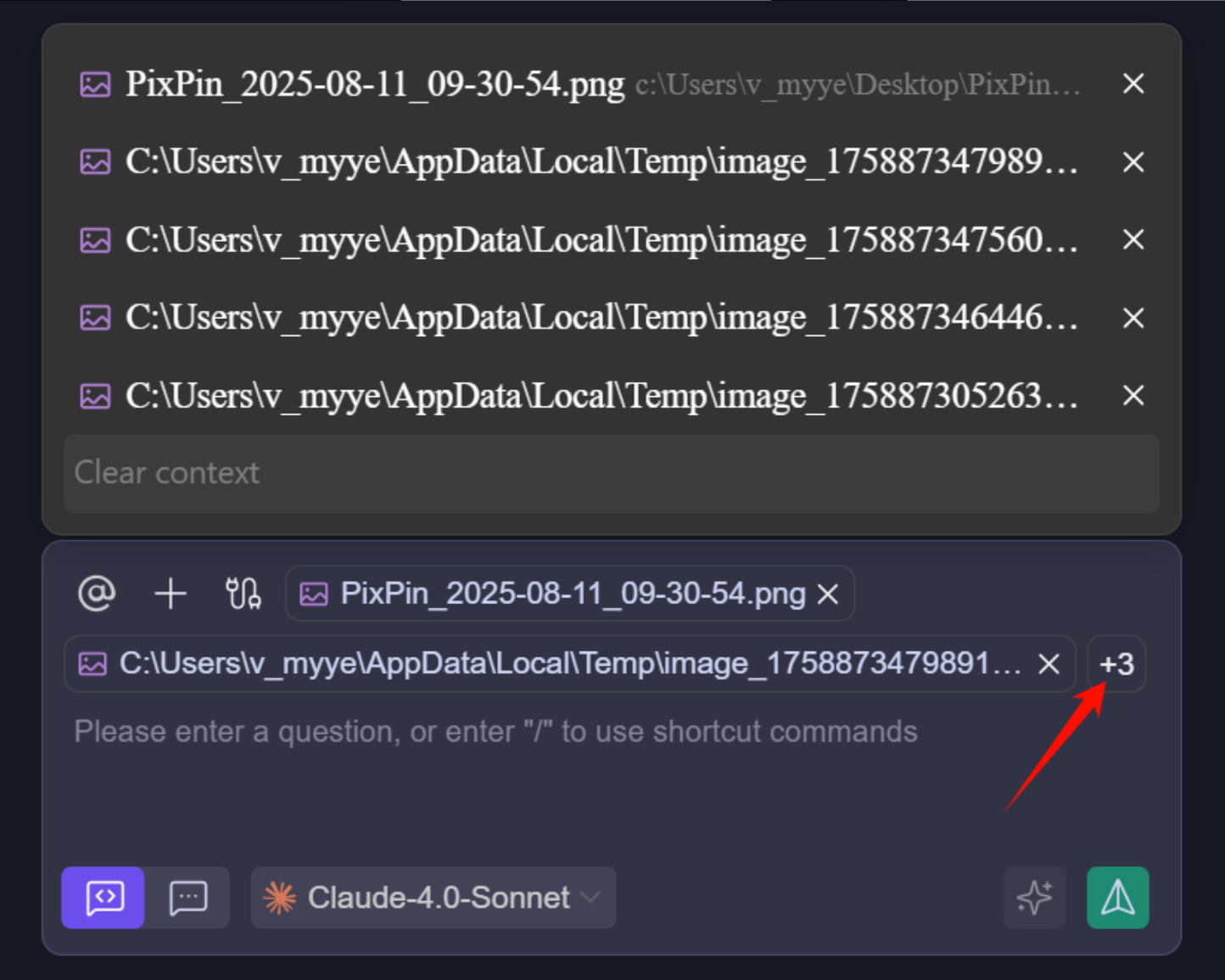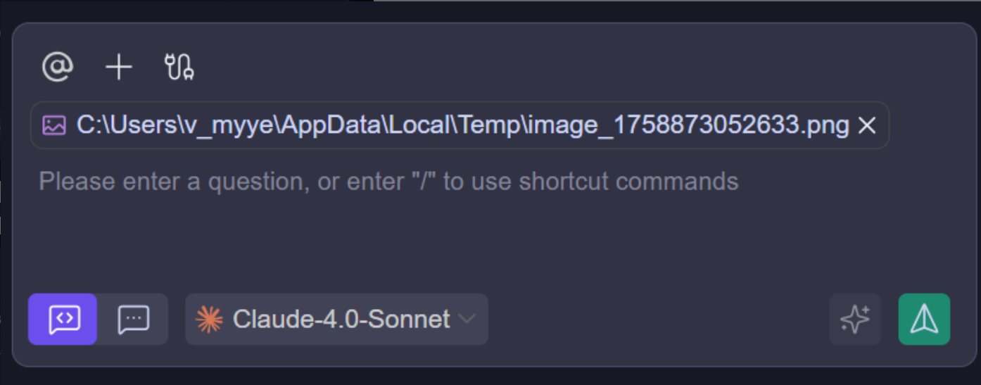 Use it for screenshots of bugs, design sketches, or any visual reference—the model will analyze the picture and help you complete your task accordingly.