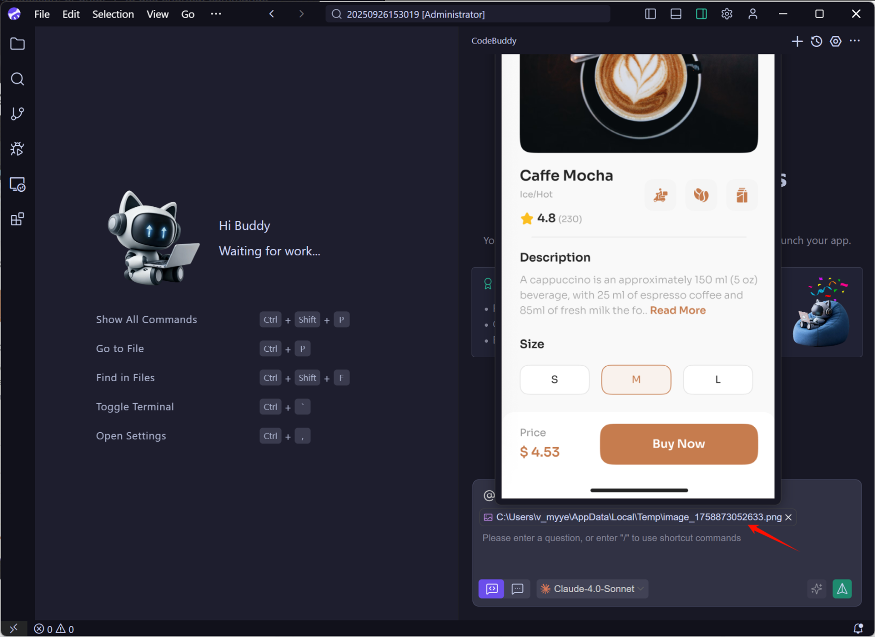 CodeBuddy IDE supports "Add from local files", letting you import local images (PNG, JPG, JPEG).