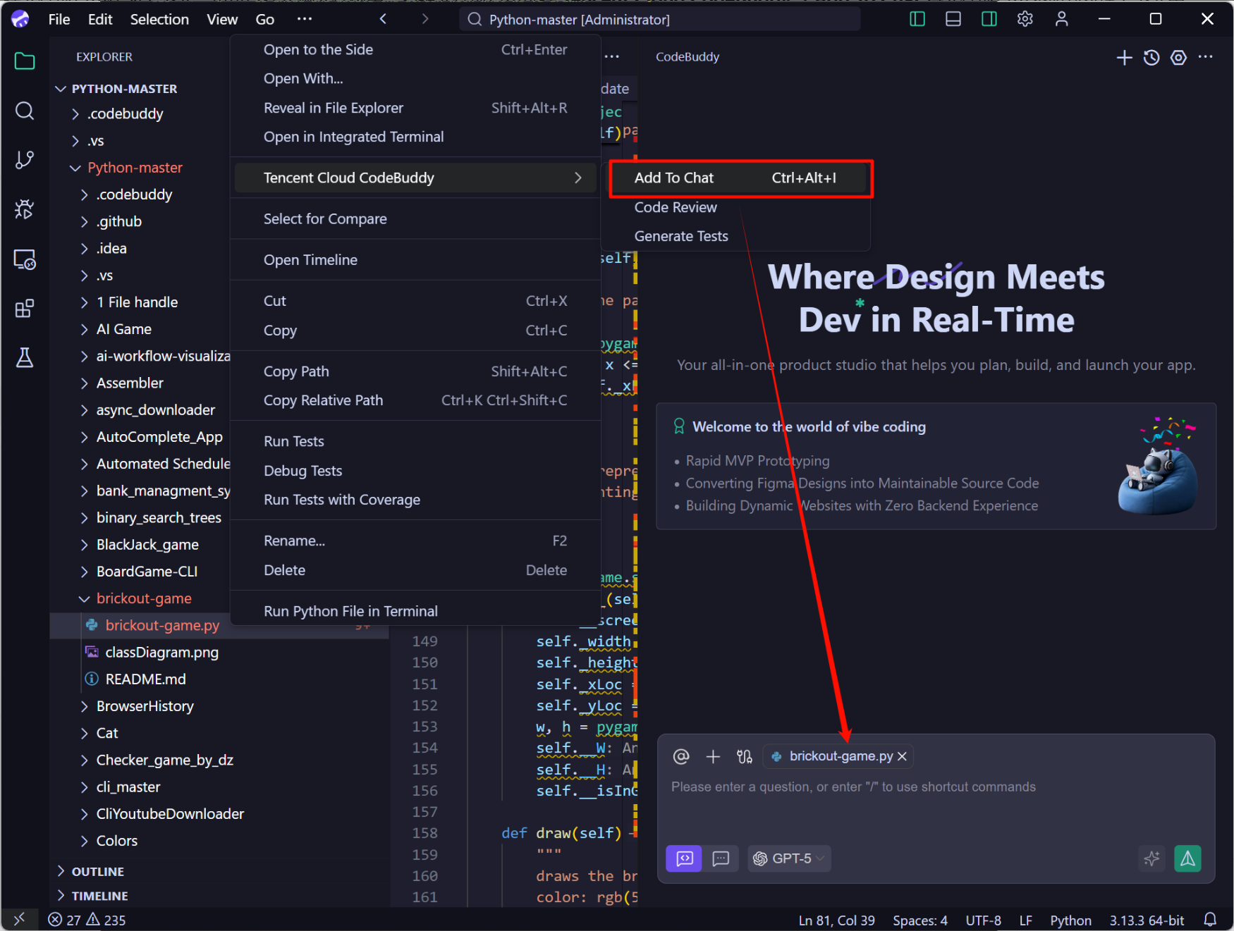您可以通过 @ 选择文件或目录作为上下文。也可以在左侧文件树中,右键文件或目录选择 Tencent CloudCodeBuddy > Add To Chat 将文件或目录添加到对话上下文中。